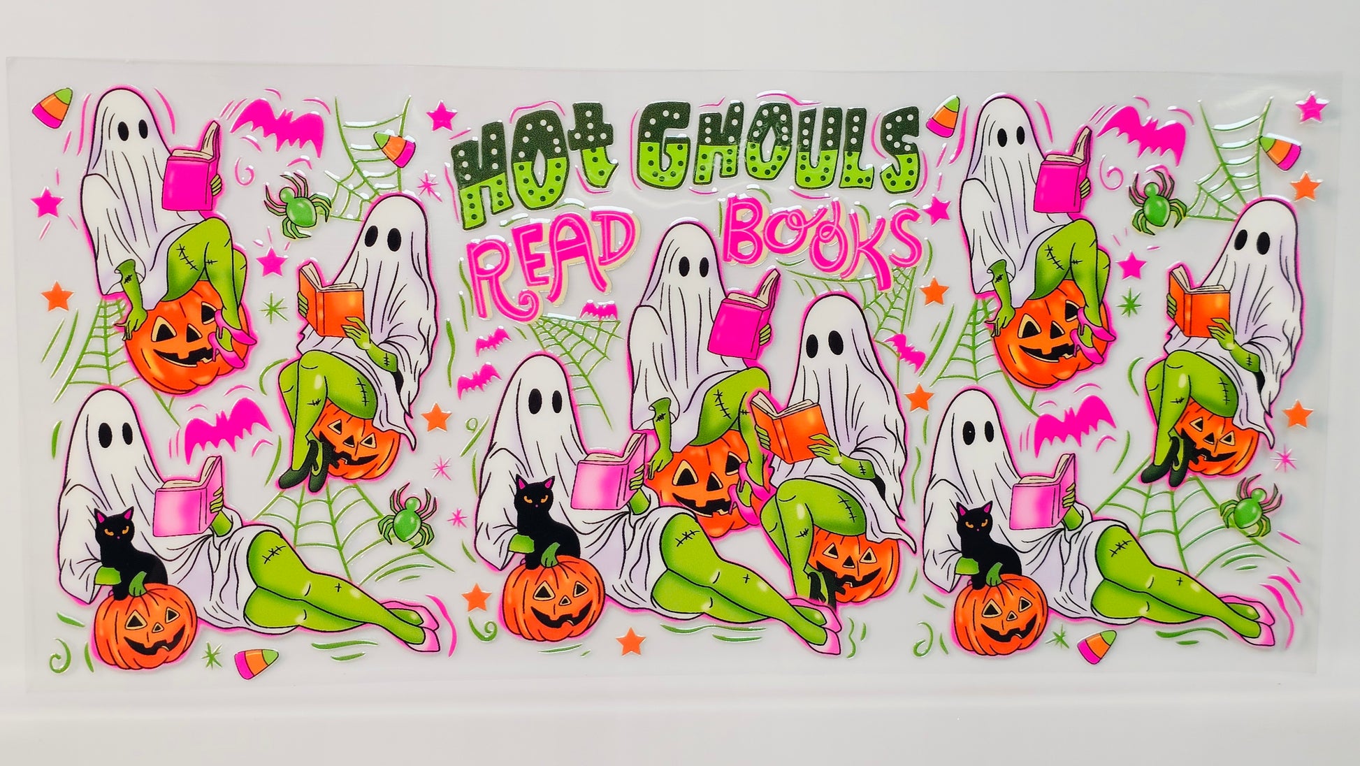 Hot Ghouls Read Books Neon Halloween Ghosties Reading Iced Coffee UVDTF Wrap 16 oz